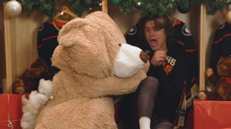 Nacionālās hokeja līgas (NHL) klubs Anaheimas "Ducks" vismaz reizi sezonā izceļas ar video, kurā hokejisti pārbiedē savus komandas biedrus, un izņēmums nav arī šī sezona. Aizsargs Kevins Šatenkirks ieģērbās lāča kostīmā un centās nobiedēt komandas biedrus. Vislabāk izdevās nobiedēt NHL gada piespēles autoru Trevoru Zīgresu.