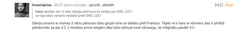 Visa šī izlases nolikšana tagad ir balstīta uz to, ka veči paši sitās, lai izcīnītu uzvaru nevis paļāvās uz to, ka dāņi iespējams uzdāvinātu mums iespēju iemest tukšos vārtos. Cirks, nekas vairāk. Es tev saku, spēlētājiem pašiem būtu pretīgi lasīt visu jūsu "ekspertu" shēmotāju viedoklis par to, ka bija jāgaida dāņu tukšie vārti.
