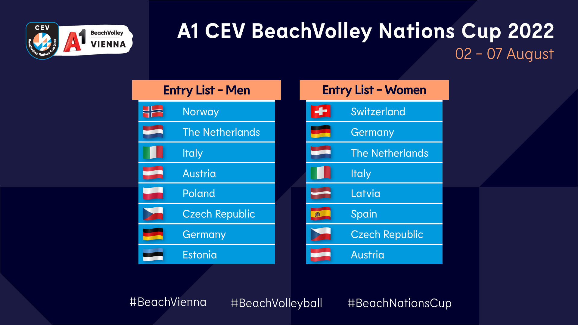 Gan sieviešu, gan vīriešu turnīrā piedalīsies astoņas pludmales volejbola valstis. Septiņas tika noteiktas pēc CEV valstu ranga, turklāt piedalīsies arī turnīra mājiniece Austrija. Sieviešu turnīrā attiecīgajai nacionālajai federācijai bija jāpiesaka divi dueti, ko veido četras no sešām labākajām spēlētājām pēc CEV pludmales volejbolistu "entry" ranga 4. jūlijā. Tāpat kā vīriešu sacensībās.