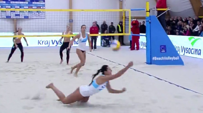 Čehijas mazpilsētas Pelhržimovas hallē turpinās "European Masters" pamatturnīrs pludmales volejbolā. Šo sacensību pusfinālos ilgākā un labākā epizode bija mačā, kur Latvijas sportistes Tīna Graudiņa un Anastasija Kravčenoka cīnījās pret vācietēm Sandru Itlingeri un Kimu Bērensu.Video: CEV - European Volleyball