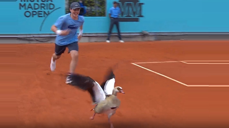 Spānijas galvaspilsētā Madridē turpinās 1000 punktu māla turnīrs tenisā. Kādā brīdī laukumā devās arī putns. Video: ATP