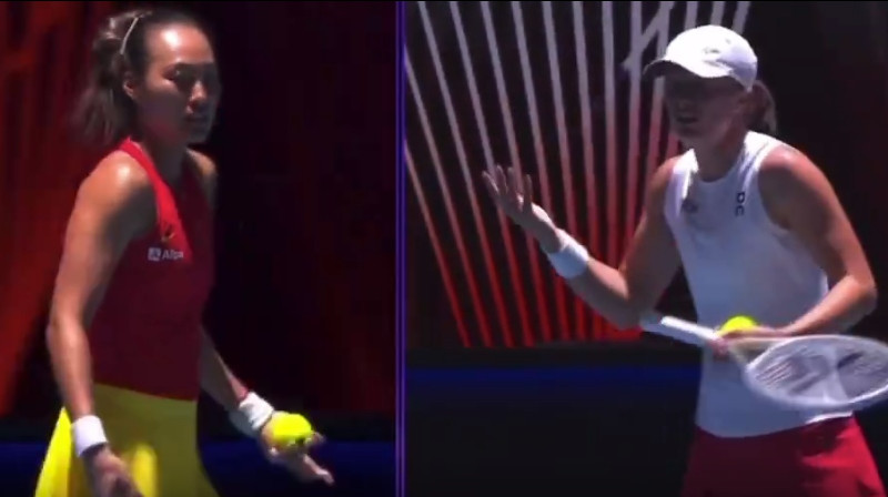 Iesildoties pirms "United Cup" turnīra mača, pasaules ranga līdere Iga Švjonteka (Polija) trāpīja Ķīnas tenisa līderei Cjiņveņai Dženai. Video: United Cup + music