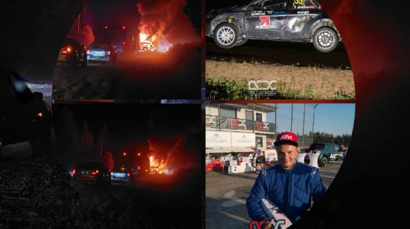 Latvijas rallijkrosa čempionam Joelim sadeg autobuss ar sporta automašīnu tajā