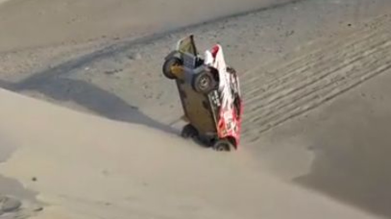 Savdabīgu avāriju Dakaras rallijā piedzīvojusi argentīnieša Alehandro Jakopini ekipāža, kuras "Toyota Hilux" pēc brauciena pāri kāpai piezemējās uz mašīnas priekšgala, tā arī iesprūstot smiltīs. Video avots: https://www.youtube.com/watch?v=l_z...