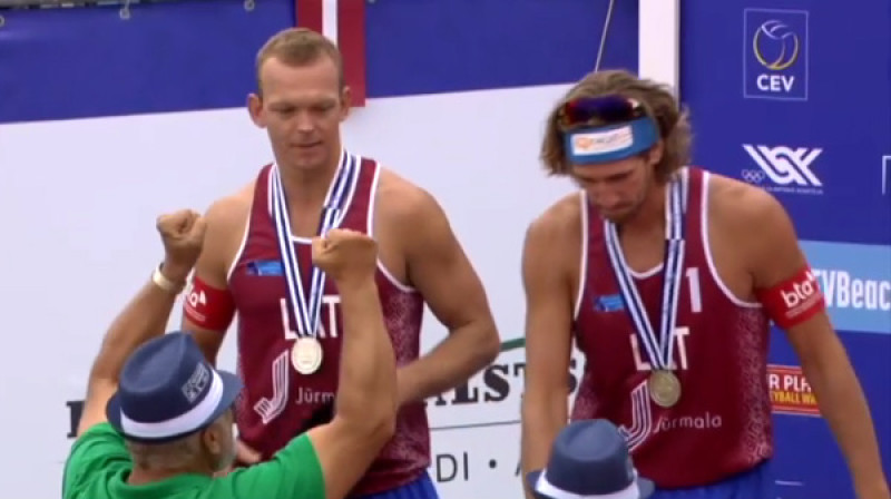 Majoros noslēdzies Eiropas čempionāts pludmales volejbolā. Latvijas vadošais duets Aleksandrs Samoilovs un Jānis Šmēdiņš svētdienas finālā zaudēja itāļiem Paolo Nikolai un Danielem Lupo (16:21, 21:23), finišējot otrajā vietā. Piedāvājam apbalvošanas ceremoniju.Video: TV6 / tvplay.lv