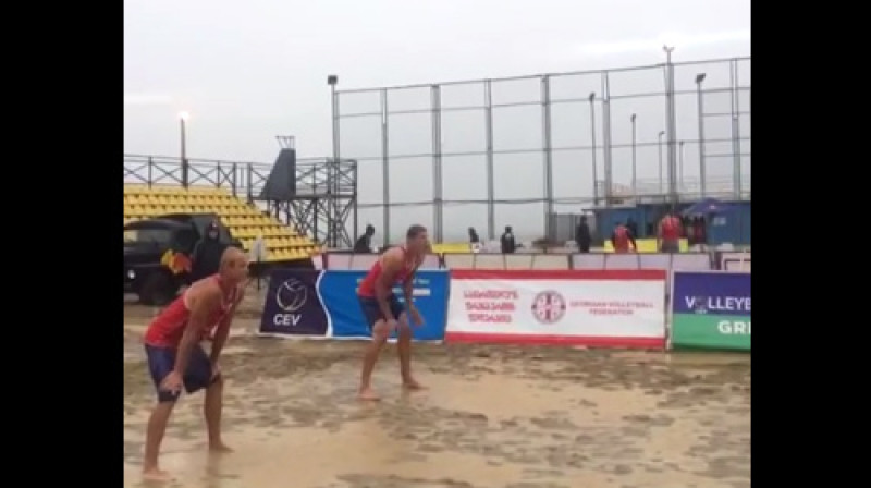 Gruzijas otrajā lielākajā pilsētā Batumi šodien turpinās Austrumeiropas Zonālās volejbola asociācijas (EEVZA) noslēdzošais posms pludmales volejbolā. Toms Šmēdiņš / Aleksandrs Solovejs (Latvija) un Aleksandrs Ļihoļetovs / Iļja Ļešukovs (Krievija) šodien spēlēja briesmīgos apstākļos, spēcīgs lietus smiltis pārvērta par dubļu laukumu. Sievietēm vakar apstākļi bija cilvēcīgi.Video: Georgian Volleyball Federation