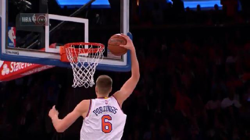 Porziņģis pārtver piespēli un triec bumbu grozā no augšas