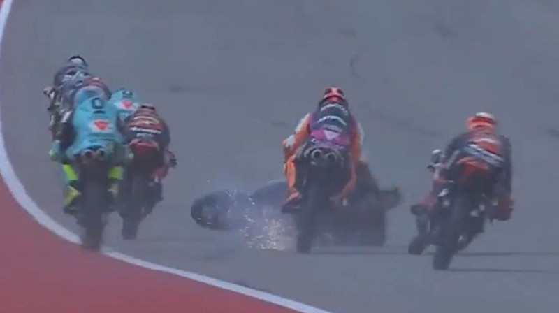 "MotoGP" pasaules čempionāta atbalsta klases "Moto3" sacensības svētdien ASV, Ostinas trasē noslēdzās ar sadursmi starp vairākiem braucējiem, kas, laimīgā kārtā, beidzās bez lieliem savainojumiem. Vainīgais bija turku braucējs Denizs Oncu, kurš ar aizmugurējo riteni aizķēra Džeremija Alkobas motociklu, izraisot sāncenša kritienu, savukārt no viņa nespēja izvairīties Andreā Minjo un arī sezonas līderis Pedro Akosta. Lai gan negadījums bija pamatīgs, visi braucēji drīz vien bija uz kājām un mediķu iejaukšanās nebija nepieciešama. Oncu par savu manevru saņēmis diskvalifikāciju uz diviem posmiem.