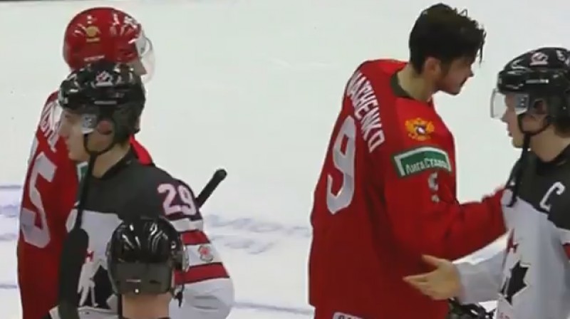 U20 pasaules čempionātā Krievijas hokeja izlase sestdien negaidīti pārliecinoši pieveica Kanādas jaunos talantus - 6:0. Uzvarētāju himnas laikā zaudētāju kapteinis Barets Heitons nenoņēma ķiveri (video nav īsti redzams), krievi protestēja, bet atsveicināšanās laikā vairāki minētajam kanādietim nepaspieda roku.Video: Match TV, Russia Hockey / TSN Sports