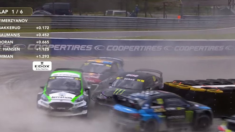 Pasaules rallijkrosa čempionāta Beļģijas posma finālbraucienā Jānis Baumanis pēc starta bija izvirzījies trešajā vietā, taču vienā no līkumiem viņam no aizmugures virsū uztriecās Liams Dorans, radot bojājumus latviešu sportista pilotētajai "Ford Fiesta" automašīnai. Turpinājums līdz ar to Baumanim bija grūtāks nekā varēja būt un finišu viņš sasniedza piektais, kamēr pirmo uzvaru izcīnīja krievu pilots Timurs Timerzjanovs. Video avots: https://www.youtube.com/watch?v=wih...
